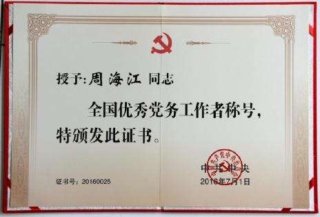 (2016年7月,周海江获“全国优秀党务工作者”称号)