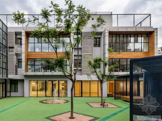 从整理室内外空间水平及垂直联系入手,对原有公共空间的脉络通过打通、连接、附加等手段使其更加联通、完整,赋予流线更多的选择和冗余度。公共空间在基本的交通功能之外,转变为儿童的游戏场所。激活外围的通道,把零散的户外空间串联在一起,室内外空间相互嵌套缠绕起来,原本孤立的中心庭院变得四通八达。地面层全部用于公共活动,除结构和必要的墙体外尽量打开室内外空间的边界。玻璃钢隔栅呵护下的户外空间构成了建筑最外圈层的景观环境,把原建筑的半围合形平面补全为完整的环形,嵌入游戏,教学和景观设施。建筑西侧的户外楼梯和栈桥从地面连接到二、三层室内走廊并延伸到屋顶运动场,帮助室内外形成更多的路径回路。