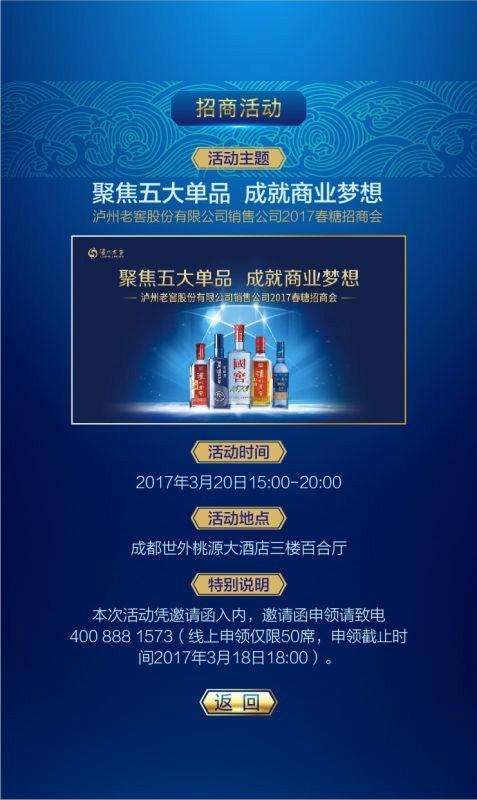 “聚焦五大单品 成就商业梦想”泸州老窖股份有限公司销售公司2017春糖招商会将于3月20日15:00-20:00成都世外桃源大酒店三楼百合厅盛大举办!招募合伙人需凭邀请函进入会场!