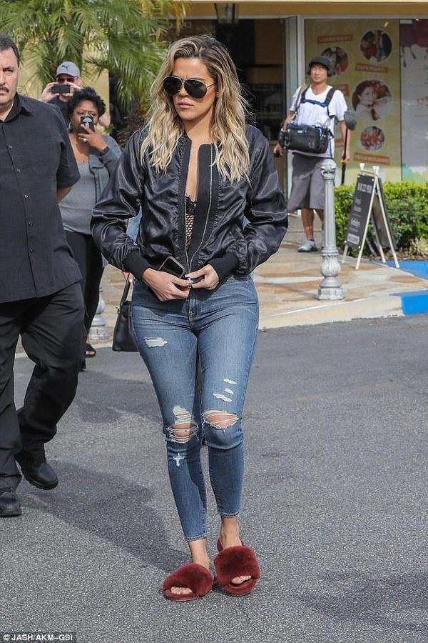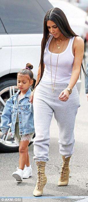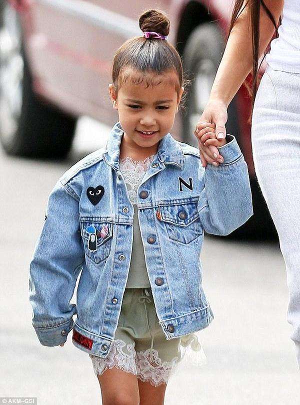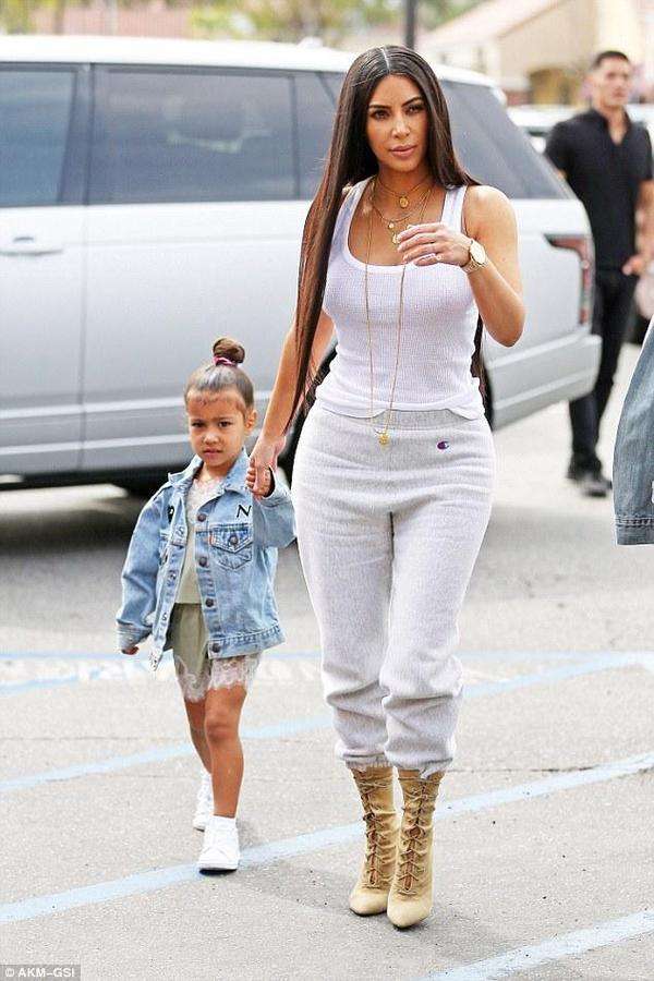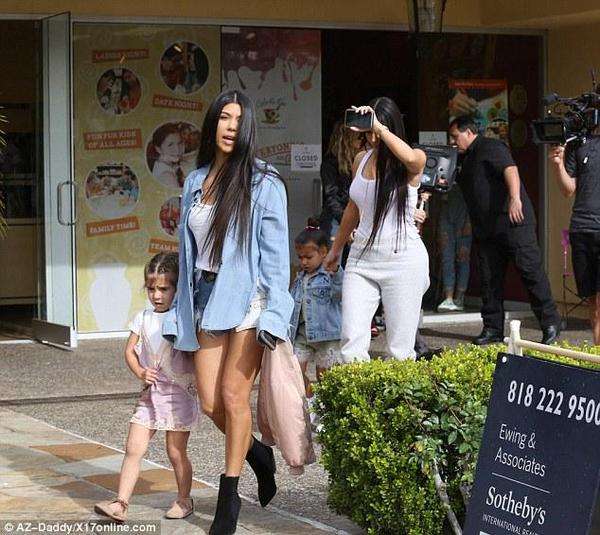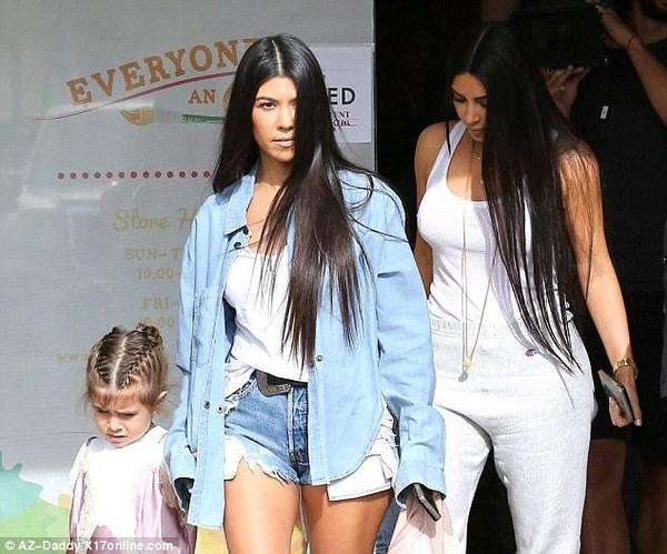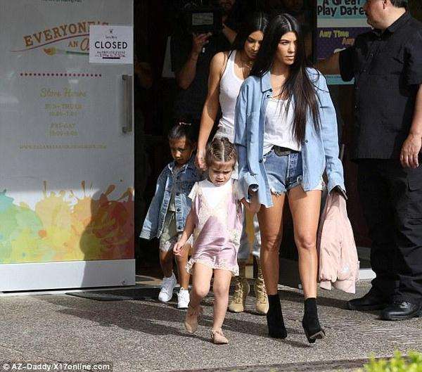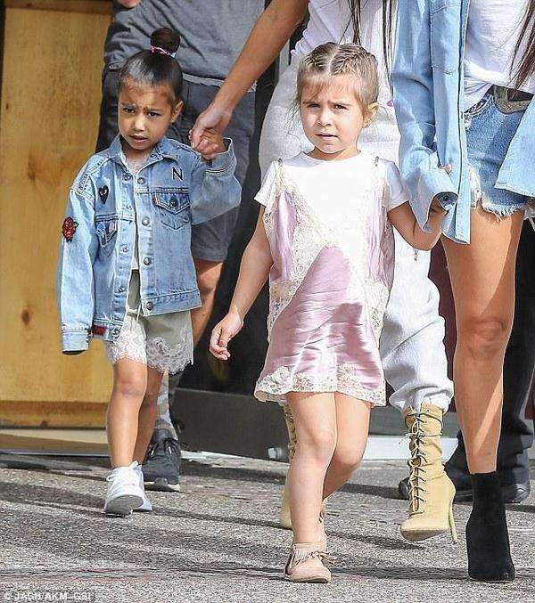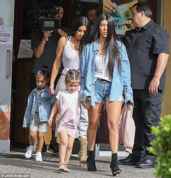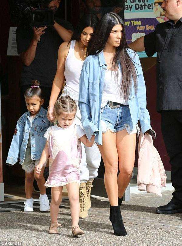 她的女儿诺斯也穿着休闲牛仔装,大姐考特尼-卡戴珊穿着一件蓝色的长袖衬衣,里面是吊带背心,下身是牛仔热裤,脚上穿着黑色的靴耶耶。她的女儿佩内洛普穿了件连衣裙。