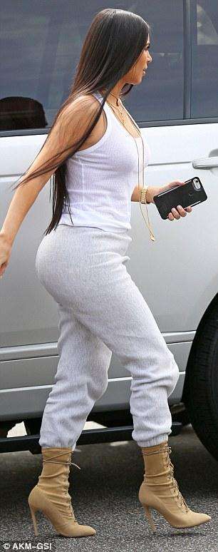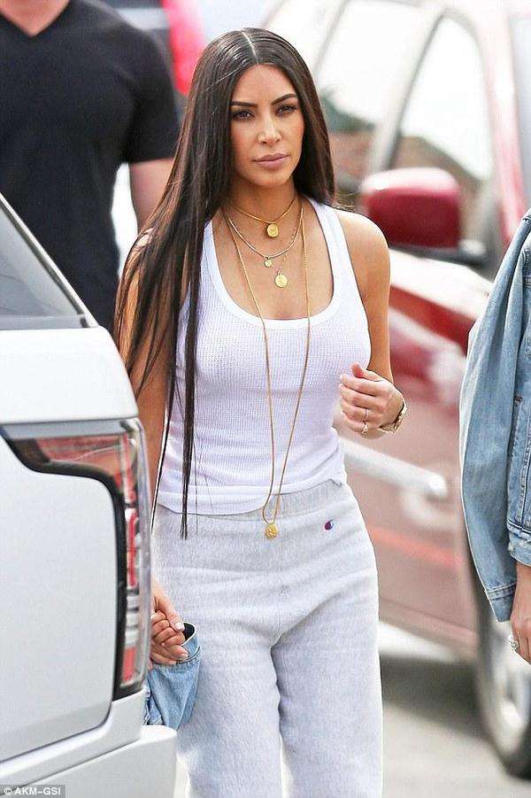 卡拉巴萨斯位于加利福尼亚的南部,这里已经热起来了,人们都穿着夏装。金-卡戴珊当天穿着一件白色的吊带背心,脚上穿着米凶巴巴的系带高跟鞋,下面是个灰色的运动裤,脖子上戴着很多黄金项莲,守着孩子她穿得很保守。