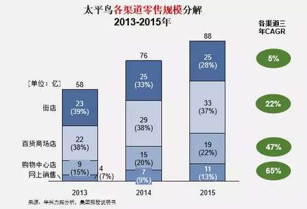 从渠道来看,2015年太平鸟集团总体营收为88亿元,其中百货商场店渠道营业收入为33亿元,在所有渠道中占比最大为37%;街店营业收入为25亿元,占比28%;新兴渠道购物中心和线上销售的营业收入分别为19亿元和11亿元,占比分别为22%和13%。线上与购物中心渠道领跑收入增长不仅是太平鸟的个案,更源于近几年消费客群流量的转向趋势。