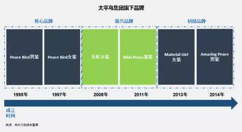 太平鸟于1995年成立,成立之初主打品牌Peacebird男装。1997年,该集团推出Peacebird女装品牌。2008年推出乐町女装品牌。2011年又推出Mini Peace进军童装市场。为进一步丰富组合,错位竞争,2013年引入国外女装品牌Material Girl,翌年推出高端男装品牌Amazing Peace。