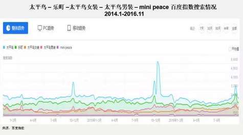 通过百度搜索指数可以看到,从2014年到今年,太平鸟、乐町、太平鸟女装、太平鸟男装、mini peace等品牌均会在双十一前后达到搜索强高峰,太平鸟集团在引流和互动效果上可谓十分显著。