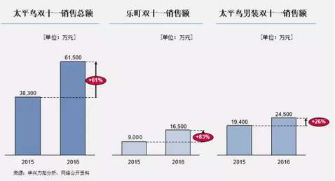 从双十一当天表现来看,2016年太平鸟集团双十一整体销售额为6.15亿元,相较于2015年增长了61%;太平鸟男装2016年双十一销售额为2.45亿元,相较于2015年增长了26%;少女品牌乐町2016年双十一销售额为1.65亿元,相较于2015年增长高达83%。