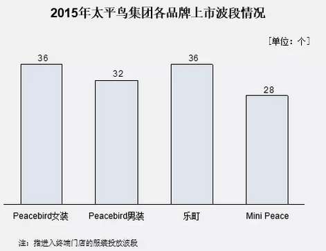 2015年,太平鸟集团服装颜色投放数量为8632款,相较于2013年数量增长了10%,也就是当年平均每个品牌一年上新1700款。与此同时,太平鸟集团在上货波段上也极为高频。2015年,Peace Bird女装上新品36波段,Peace Bird男装上新品32波段,乐町上新品36波段,Mini Peace童装上新品28波段。平均下来,零售门店确保平均每1-2周上一次新品。
