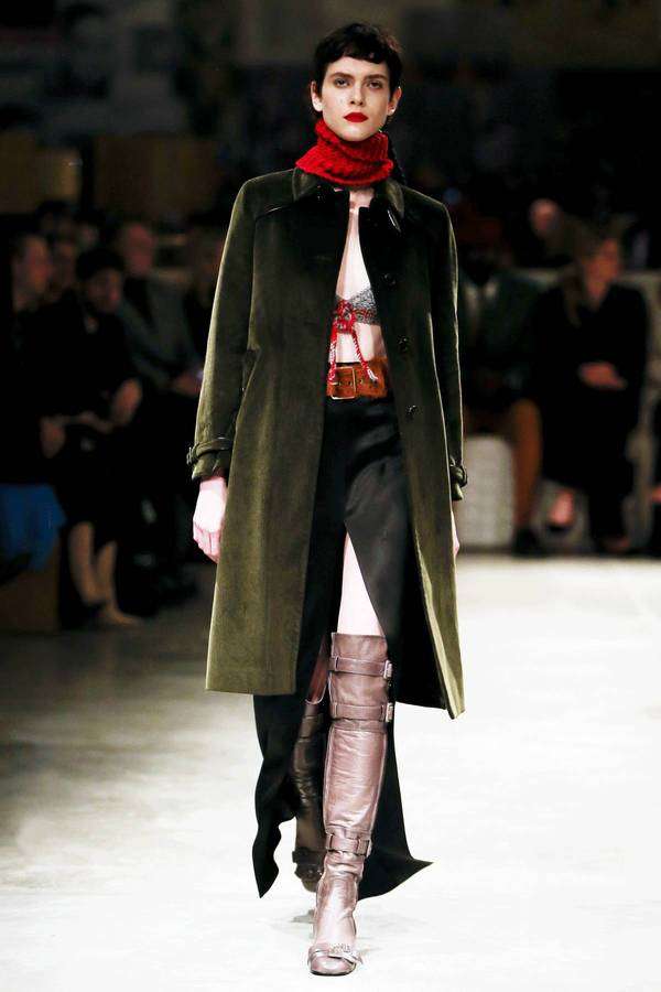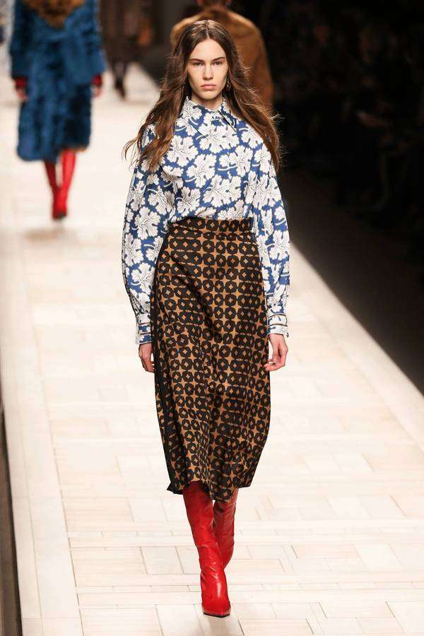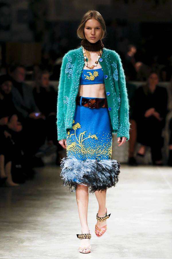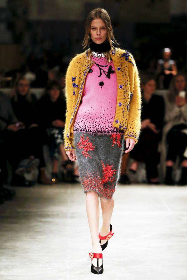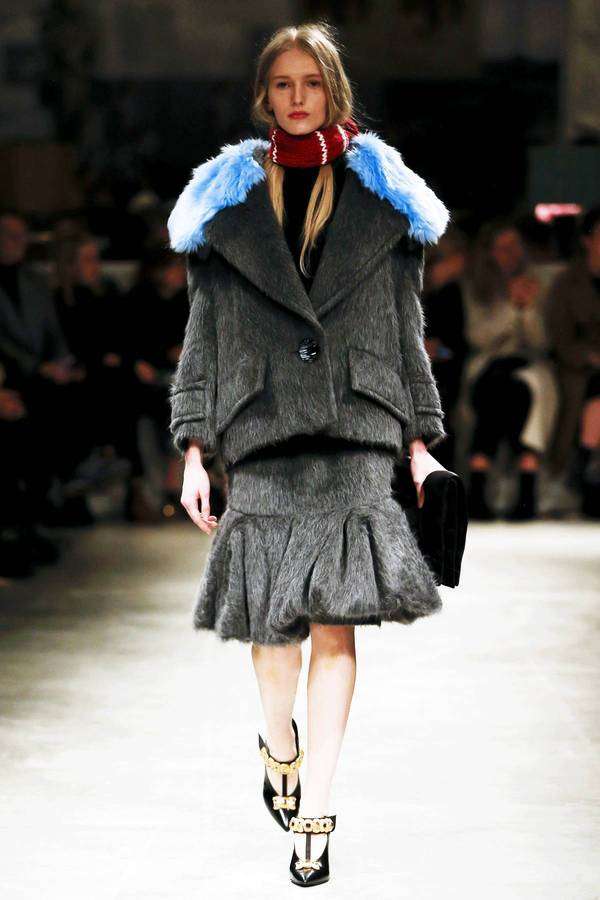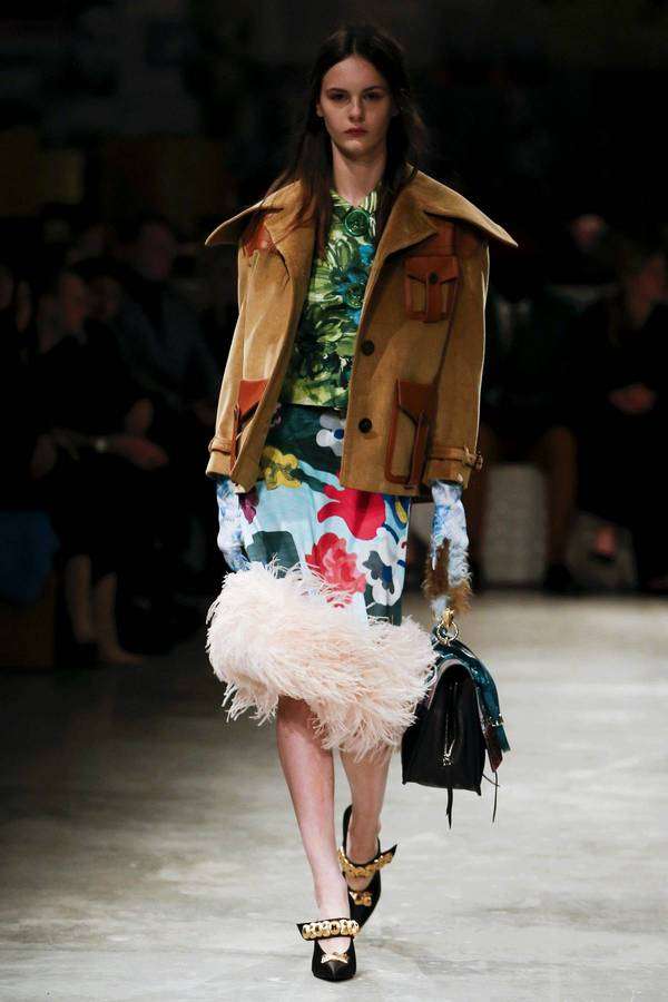 本季 Prada 秀场里出现了床、橱柜、满墙的怀旧招贴画,这些物品的灵感来自曾经的通俗小说插图,当年的俗品味经过时间更替,竟然脱胎成了张扬的新时髦!至于这些为嬉皮年代的摩登女郎而生的漂亮衣服,拥有浓郁复古的色调,又可以与拼接皮草、灯芯绒喇叭裤、手工针织围巾和报童帽灵活融合,由此形成致命的吸引力。