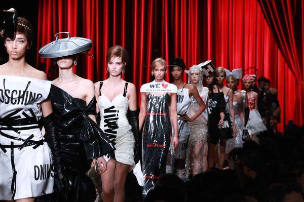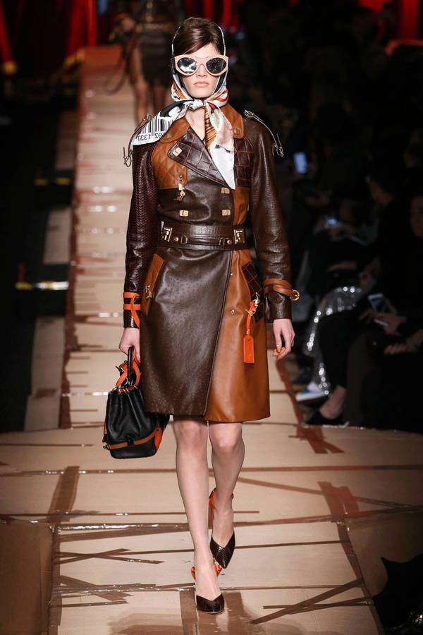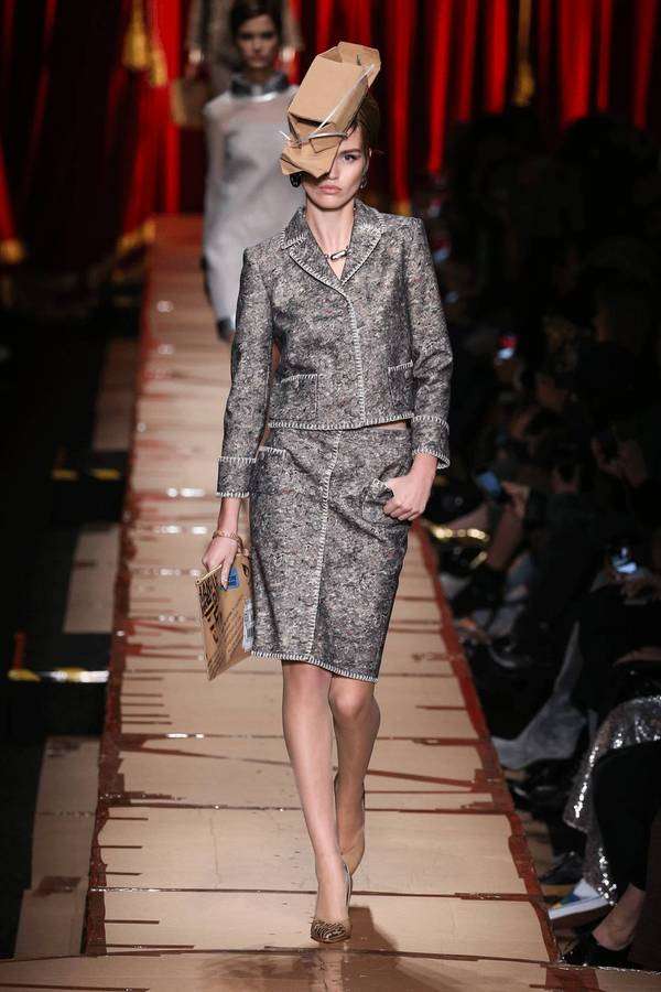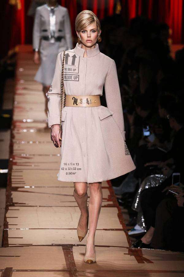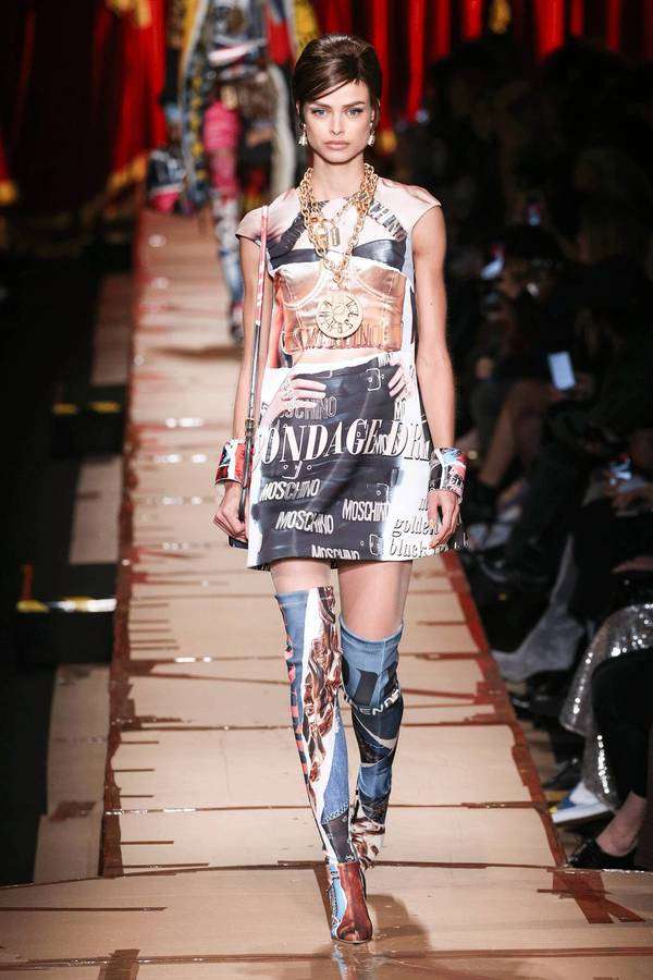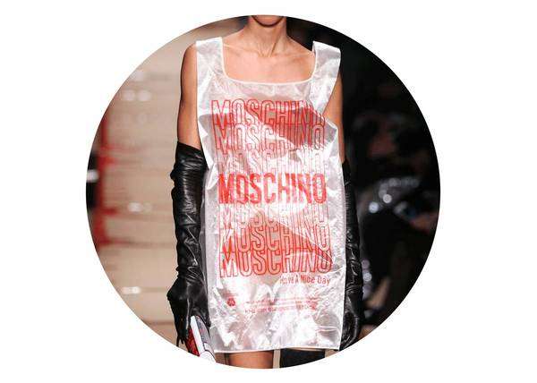 本性张扬的时装女玩家们,肯定要情不自禁地继续为本季的 Moschino 掏钱,每一身秀场 Look 都是有态度的戏谑先锋的不二选择。各种日常生活中弃之不用的商品包装元素,塑料袋、纸箱、胶带、包装纸以及混乱感拼接的广告图案,实在好玩极了。