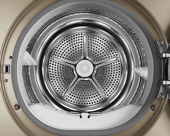 该机机门可以180°广角打开,用户取放衣物都很方便,取出筒内的烘干支架,和常见的滚筒洗衣机十分相像。8公斤的烘干容量,可以说连大型的床单被罩也不在话下。