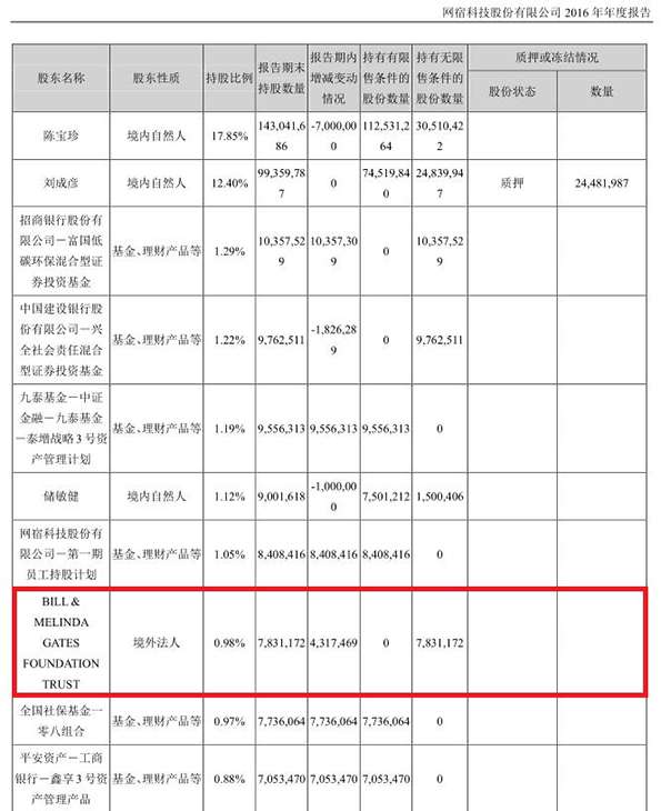 由于此后的报告中,盖茨基金持股数量均未跻身网宿科技十大股东,因此直到2016年三季度末,盖茨基金的持仓动向才再度得以公开。