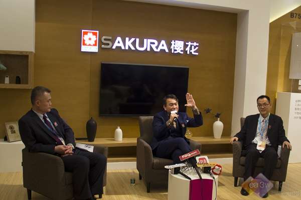图为SAKURA樱花总经理黄耀庆(中)、营业处总监孙保奇(右)、整体厨房副总沈铭中(左)接受媒体采访