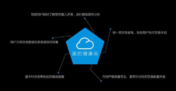 营养和健康是厨房生活的基本落点,也是美的集团自始至终坚持的发力点。为了实现这个基本诉求,美的i+智能厨房生态系统一开始就以美的健康云为依托,建立了完整权威的饮食营养和健康数据库,为用户提供多维度全方位的健康咨询和饮食营养指导。无论是各类食材的营养成分、功效、储存和搭配技巧,还是各种健康美食的烹饪秘笈,以及海量的养生保健知识,用户都可以随时通过健康云获得专业、权威的解答。此外,i+智能厨房生态系统通过各个智能家电对用户饮食数据和生理数据(体重、血压、血糖和心电等)进行采集,并整合多种数据,通过健康云的解析算法来分析、评价每个个体的健康和营养摄入状况;在上述基础上,i+智能厨房生态系统反复研究人类的科学营养配比,应用健康云基于用户多维度数据的营养分析算法和配餐模型,为每个用户制定最适合自身的饮食配餐方案,提供相应的营养搭配建议,实现用户营养和健康层面的最大价值。