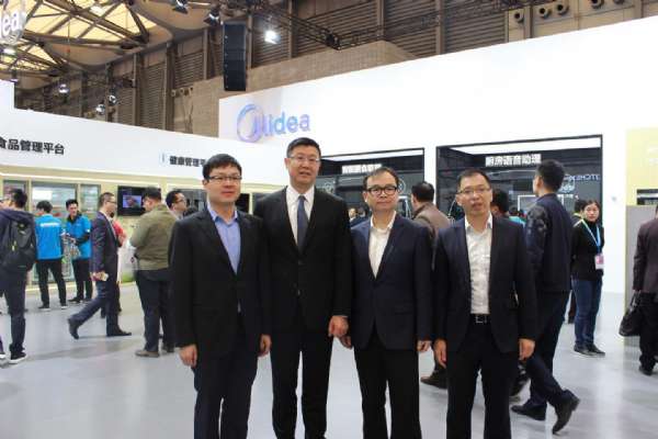 (图片人物从左到右依次为美的冰箱事业部总经理王建国,美的集团副总裁兼中央研究院院长胡自强,美的生活电器事业部总经理李国林,美的智慧家居科技有限公司总经理李强)