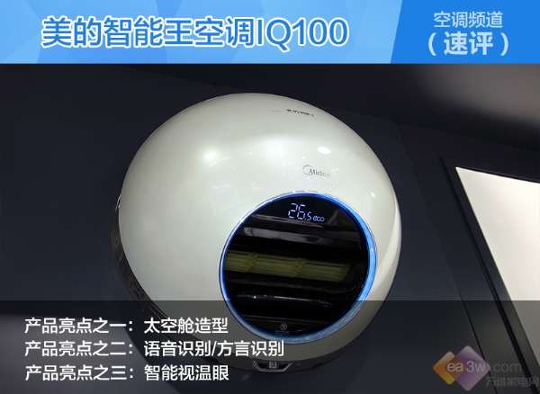 \u00A0 \u00A0 \u00A0 首先,在“空气舒适”主题展区,美的重点展示了“智能王IQ100”空调。除了外观的与众不同,美的智能王IQ100挂机最吸引人的是内置的人工智能系统,可以实现语音识别功能,其中包括“语义识别、方言识别、自由对话”三大功能,用户能够在5米距离内通过语音操控实现开关机、调节温度等。