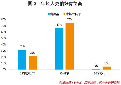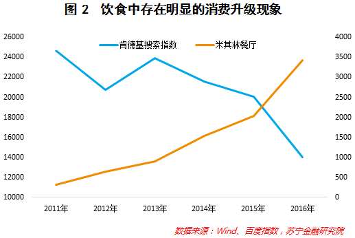 图2显示了肯德基搜索指数和米其林餐厅搜索指数在近6年的走势,显而易见:肯德基搜索指数不断下滑,米其林餐厅搜索指数不断提升。这说明,随着我国人均收入稳定增长,居民开始摆脱简单的西式快餐,更加追求餐厅的口味和品质。
