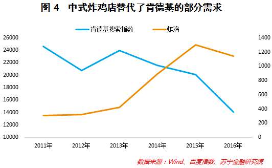 图4显示了肯德基搜索指数和炸鸡搜索指数的走势。可以发现2014年和2015年炸鸡搜索量暴增,与此对应的是肯德基搜索量持续下滑,因此,可以说中式炸鸡店的流行替代了肯德基的部分需求。