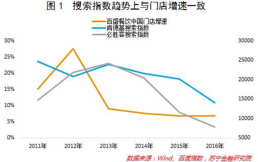 这篇文章采用百度指数来阐述观点,首先自然得看百度指数的数据质量怎么样。下图1显示了百盛餐饮中国门店增速与肯德基和必胜客搜索指数的走势,可以看出,在趋势上是比较一致的。
