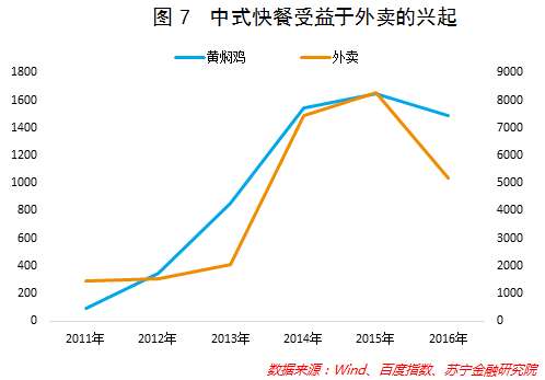 外卖的兴起与生活节奏加快、年轻人的宅习惯等因素有关,同时也带动了中式快餐的销售,比如黄焖鸡的搜索指数和外卖的搜索指数在趋势上十分一致(参见图7)。