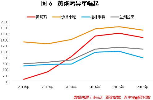 虽然肯德基没落了,但黄焖鸡强势崛起了。目前中式快餐的四大金刚分别是:沙县小吃、黄焖鸡、兰州拉面和桂林米粉。从搜索指数看,2013年黄焖鸡的搜索量已经超过了兰州拉面和桂林米粉,2014年更是把兰州拉面和桂林米粉远远甩在了后面,但截至目前,黄焖鸡的搜索量还没有超过沙县小吃,沙县小吃仍稳坐头把交椅(参见图6)。