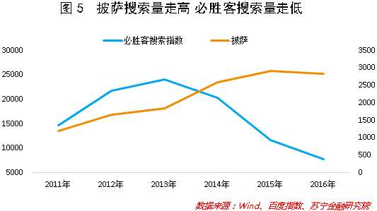 与此相似,必胜客以披萨为主打,但其他披萨店也对必胜客的销售形成了分流。表现在数据上,就是披萨搜索指数持续提升,但必胜客搜索指数逐步下降(参见图5)。