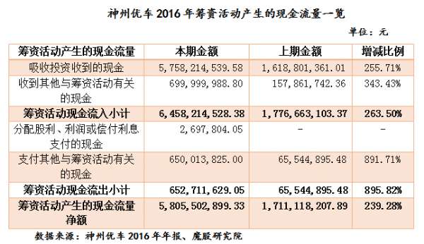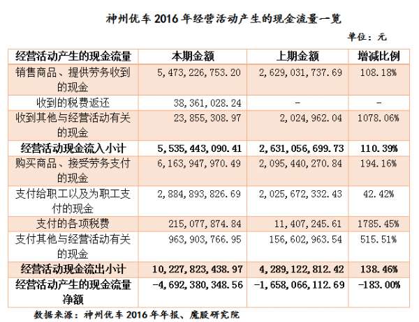 神州优车2016年经营活动产生的现金流量净额为-46.92亿元,比去年同期减少30.34亿元。虽然2016年神州优车的业务量大幅增加,经营活动收到的现金流入比去年同期增加,但是以此同时,购买商品、接受劳务所支付的现金以及支付给职工的现金也相应随之增加。此外,魔股研究院(www.muuguu.com)还了解到,2016年因新增神州买买车业务,购买车辆所支付的现金也相应增加。所以导致神州优车经营活动产生的现金流净额减少较大。