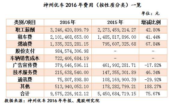 神州优车2016年的费用总计达到惊人的95.75亿,几乎是2015年费用的两倍。按类别来看,职工薪酬、租车费和燃油费依然是费用最高的项目,而且相比2015年都产生了较大幅度的增长,分别烧掉了32.46亿元、21.01亿元和13.35亿元。而由新开辟的买买车业务带来的车辆销售成本同样使费用新增7.2亿元。另外,神州优车2016年实施了员工股权激励,因此确认一次性股份支付9.84亿元,同样导致了费用的增加。