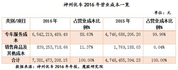 2016年神州优车收入构成全部来自于主营业务收入,未产生其他业务收入。按类别来看,神州优车的营业收入仍然主要来自于专车服务收入。专车服务营收50.58亿元,增幅为190.45%,占公司营业收入的86.53%。虽然营收大幅增加,但是净利润依然亏损的主要原因是专车业务依旧烧钱。2016年专车业务营业成本达65.42亿,占公司营业成本的88.63%。