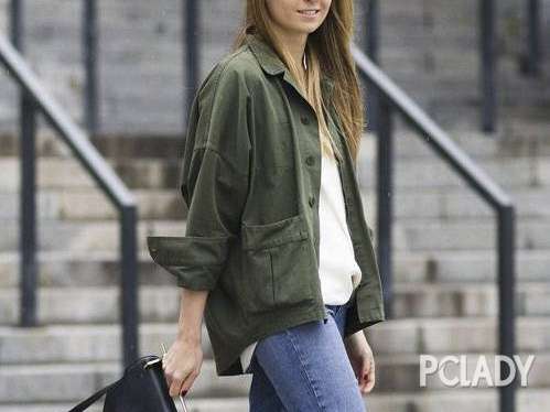 长款的军绿色外套不好驾驭,就换这种衬衫式的短款薄外套,搭配条纹T恤和紧身牛仔裤,人人都能hold住。