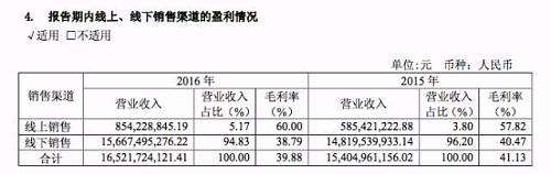 在海澜之家毛利下滑的情况下,海澜之家的销售模式也存在争议。2016年财报中显示,海澜之家的销售渠道分为线上销售与线下销售,其中线上销售的营业收入为8.54亿元,占比为5.17%,线下收入的占比为94.83%,不难看出,线上销售占比并不大,线下销售的模式才是海澜之家服饰销售的主要模式。