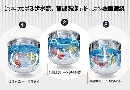 洗涤时首先通过搅拌水流打散衣物,就像手洗一般揉搓呵护洗涤;再利用冲浪水流拍打衣物,深层洁净去污;最后利用喷瀑水流强力冲刷,祛除残留洗涤剂和污水,让衣物彻底洁净。