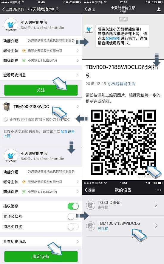 该机还支持在手机端使用小天鹅微载系统L-SMART,远程设置洗涤参数,洗涤结束微信平台还能推送完成提醒,即使上班也能轻松洗涤。