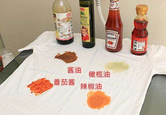将纯白色文化衫用“酱油、橄榄油、番茄酱和辣椒油”四种生活常见污渍涂抹,模拟家庭常规洗涤过程,选择洗衣机“标准洗”程序,对衣物进行洗涤测试。