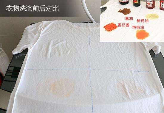 经过一番清洗,我们对比衣物前后的污染情况,可以看出酱油和橄榄油的污渍已经没有任何痕迹了,番茄酱和辣椒油的污渍也有明显减轻,而且还没发生衣物缠绕问题,可以说在洗衣、护衣两方面表现都非常不错。