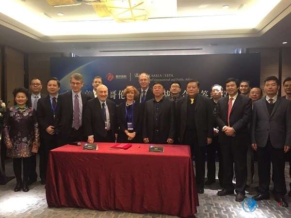 国轩高科董事长李缜(右)代表公司与哥伦比亚大学国际公共事务学院院长Merit E.Janow签署战略合作协议