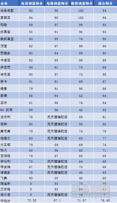 在这份新鲜出炉的报告中可以看到,尚品宅配在综合得分上遥遥领先,得到94分的高分排名榜首。同时尚品宅配在各分项的得分也尤为突出:在电商调查和微信调查的得分方面均居第一,其中微信调查更是取得了满分的傲人成绩。