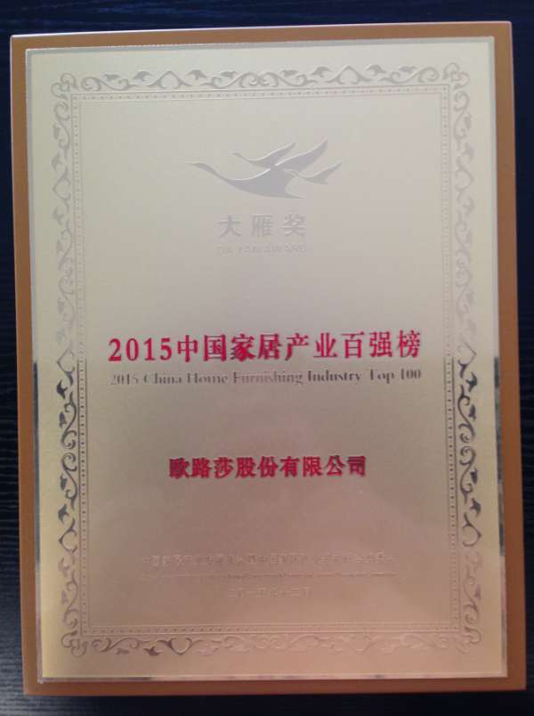 2015年12月27日,第三届中国家居产业发展年会暨中国家居产业领袖峰会在北京国家会议中心隆重召开,作为中国质量检验协会团体会员单位的欧路莎股份有限公司应邀出席盛典,并凭借良好的品牌知名度和美誉度再次荣登2015年度中国家居产业百强榜。