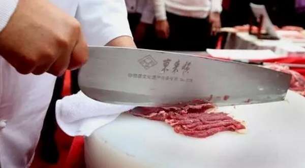 “东来顺的涮羊肉只选择这五个部位。”陈立新解释,涮羊肉是东来顺代表性菜肴,切肉是关键环节。半公斤羊肉可切20厘米长8厘米宽的肉片80到100片,每片仅重4.5克,且片片对折,纹理清晰,投入汤中一涮即熟。“切羊肉又讲究刀工、外形,所以羊肉需冻得有一定的硬度才能切。”