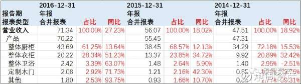 公司橱柜业务经过二十余载的发展,增速逐渐放缓,2016年公司整体橱柜收入43.69亿元,同比增长13.6%。但公司新开辟的衣柜业务处于快速放量阶段,正逐步成为公司新的业绩增长点。2016年,公司整体衣柜业务实现营业收入20.2亿元,同比增长51.2%。目前公司6成收入来自橱柜,3成业务来自衣柜,剩下少量整体卫浴和定制木门等业务。公司分业务收入如下:单位亿元