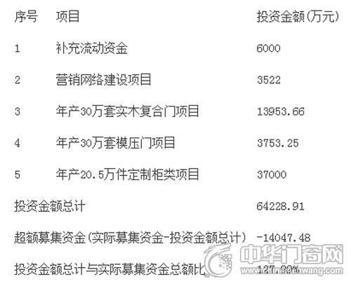 据了解,江山欧派本次发行募集资金将投资于“年产30万套实木复合门项目”、“年产30万套模压门项目”、“年产20.5万件定制柜类产品项目”、“营销网络建设项目”、“补充流动资金”五个项目,募集资金投资项目达产后,能够缓解产能不足,完善产品结构,为公司战略规划提供基础,增强公司市场竞争力,巩固公司的行业地位。