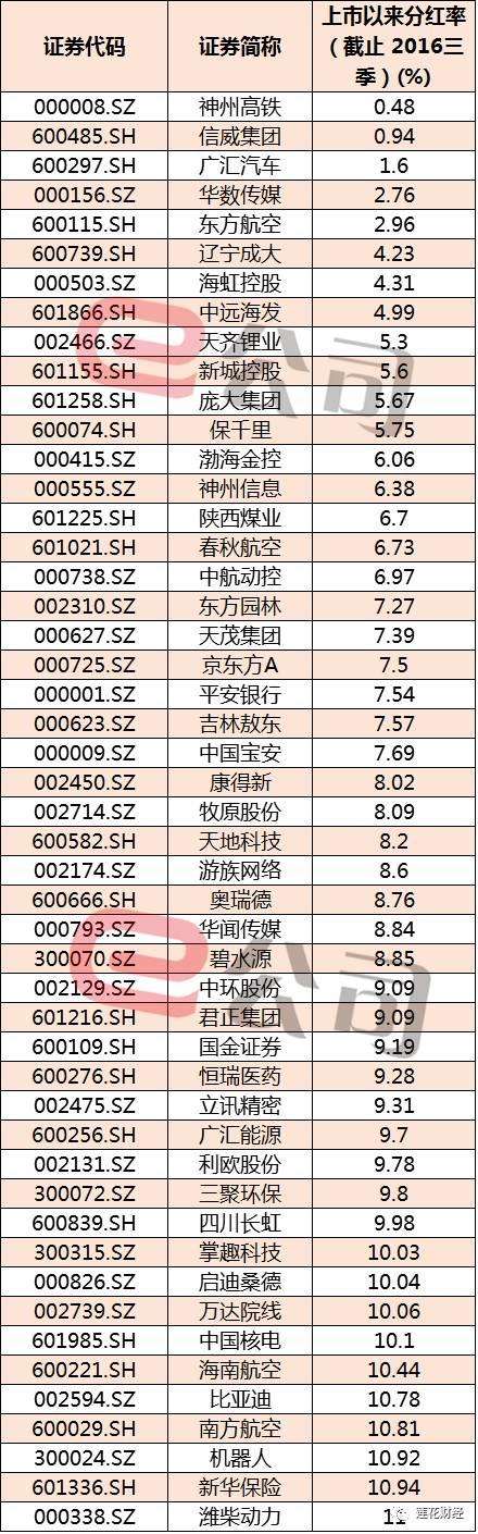 有“现金牛”就有“铁公鸡”, 下表统计了沪深300成分股中上市以来分红率最低的50只股票。