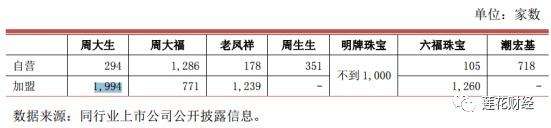 截至2016 年6月30日,周大生拥有自营店294家,加盟店1994家,相比其他两家周姓珠宝店,加盟店占主流。对比如下: