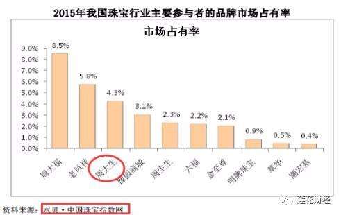 具体来看,中国珠宝行业老大是周大福,老凤祥第二,自己是老三,周生生第四。境内珠宝首饰市场品牌占有率前三名市场份额为18.60%。