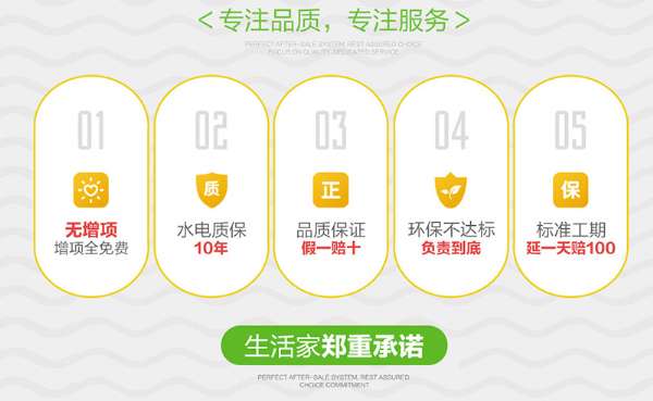 此外,不同传统装修,在业主签单时往往“信誓旦旦”;一旦遇上家装售后,后期维权却变成了“踢皮球”,所有承诺变成了“空头支票”。生活家高品质的服务团队,重视每一位客户的感受,给予从始至终的尊贵服务。装前家装协议,装后售后保障卡,“水电10年质保”、“假一赔十”、“环保不达标负责到底”等承诺全部兑现,绝不开空头支票。
