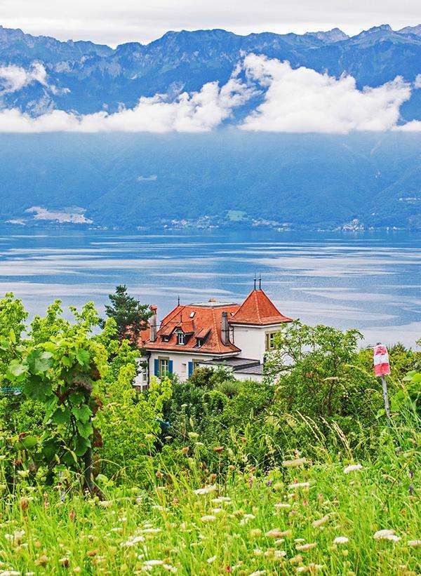 然而,从蒙特勒坐火车经沃韦到小村谢布尔,下车后眼前的画面仍是让人惊艳。谢布尔车站位于山腰,从这里眺望,下方小镇的红瓦屋顶从满眼绿意中升起。稍远些的日内瓦湖安谧平静,泛着白光,偶尔一艘私家游艇或渔船经过划出水线。对岸庞大的阿尔卑斯山山顶缭绕着氤氲雾气,山腰地飘着一段云绸。画面如诗如歌。