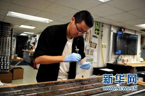 中国科学院南海海洋研究所苏翔在“决心”号上进行“超微化石”取样(3月21日摄)。新华社记者 张建松 摄