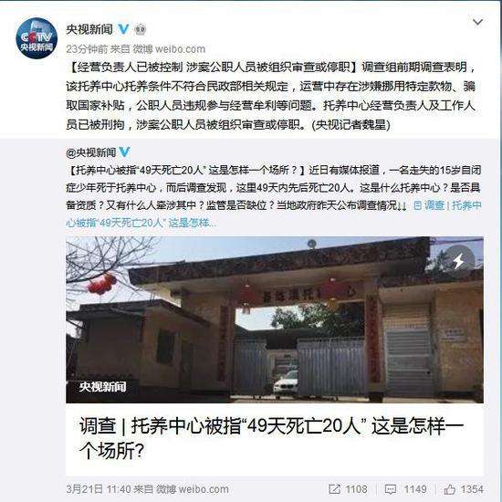 调查组前期调查表明,该托养中心托养条件不符合民政部相关规定,运营中存在涉嫌挪用特定款物、骗取国家补贴,公职人员违规参与经营牟利等问题。托养中心经营负责人及工作人员已被刑拘,涉案公职人员被组织审查或停职。(央视记者魏星)