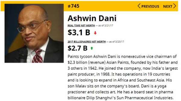 涂料大亨Ashwin Dani以27亿美元身家排名第745位。亚洲涂料(Asian Paints)是由Ashwin Dani的父亲和其他3个人于1962年创立,该公司年销售额为23亿美元。Ashwin Dani,于1968年加入亚洲涂料,目前任公司的非执行副董事长。亚洲涂料现在是印度最大的涂料生产商,在19个国家开展业务,在非洲和东南亚扩张。他的儿子马拉夫任职公司的董事会。Dani是一个瑜伽练习者,并收集艺术。他在医药亿万富翁Dilip Shanghvi的太阳药业有一个董事会席位。