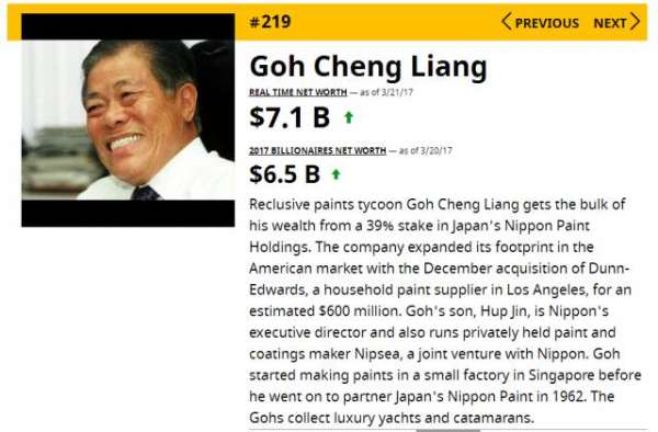 立时集团(Nipsea)创始人、新加坡“油漆大王”吴清亮(Goh Cheng Liang)以65亿美元身家排名第219位。Goh Cheng Liang从日本立邦控股公司的39%股权中获得了他的大部分财富。该公司在12月收购了位于洛杉矶的家用涂料供应商Dunn-Edwards,预计将扩大其在美国市场的业务规模,预计为6亿美元。Goh的儿子Hup Jin是立邦的执行董事,还经营私人持有的涂料生产商Nipsea,该公司是与立邦的合资企业。Goh开始在新加坡的一家小工厂制作油漆,之后于1962年与日本立邦油漆公司合作。Gohs收集豪华游艇和双体船。