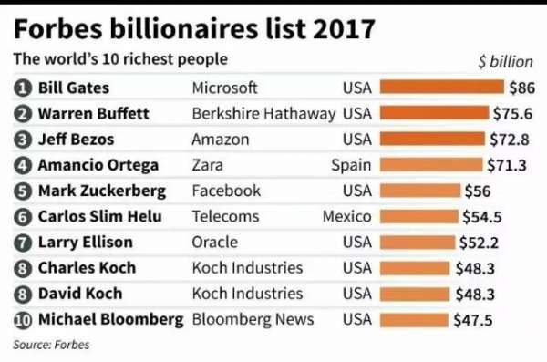 据悉,2017年入选富豪榜的共有2043人,比2016年增加233人,是《福布斯》富豪榜设立以来最多的。此外,众位富豪们的平均资产高达37.5亿美元。排在榜首的盖茨以860亿美元的身家笑傲群雄,资产相比去年增长110亿美元;紧随其后的是“股神”巴菲特,其资产为756亿美元;亚马逊首席执行官(CEO)杰夫·贝索斯以728亿美元的身家首次进入前3。