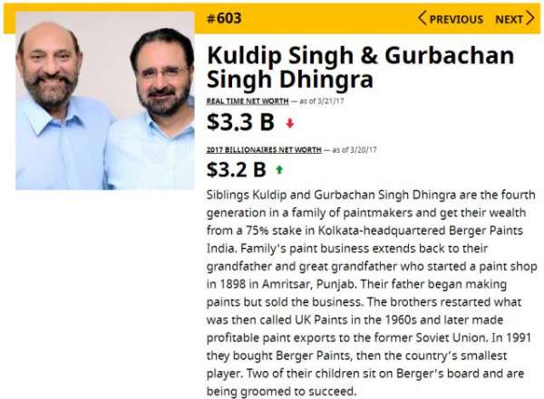 Kuldip Singh & Gurbachan Singh Dhingra兄弟以32亿美元身家排名第603位。Kuldip和Gurbachan Singh Dhingra兄弟是油漆工人家族的第四代,他们从总部位于印度加尔各答的伯爵涂料(Berger Paints)的75%股权中获得财富。家族的油漆业务延伸至他们的祖父和曾祖父,开始在1898年在阿姆利则旁遮普邦的油漆车间。他们的父亲开始制作油漆,但卖了业务。兄弟重新启动了,在20世纪60年代时被称为英国油漆,后来向前苏联出口有利可图的油漆。1991年,他们购买了伯爵涂料,然后是该国最小的玩家。他们的两个孩子坐在伯爵的董事会,正在逐步走向成功。